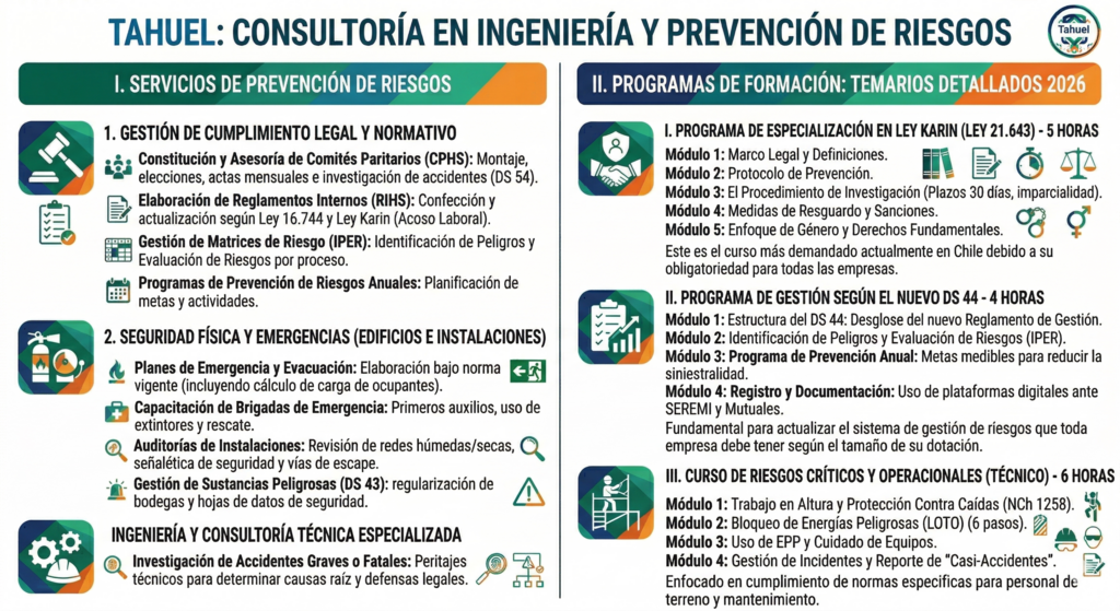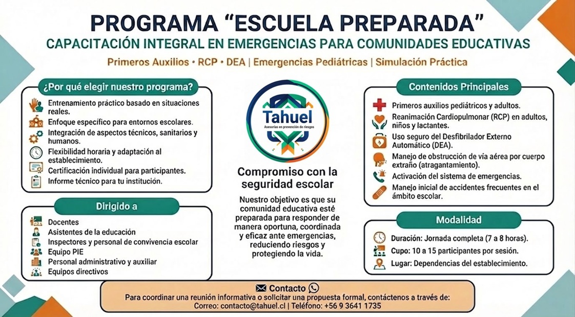 "En Tahuel, entendemos que el colegio es el segundo hogar de nuestros niños. Por eso, hemos diseñado el programa 'Escuela Preparada', una capacitación técnica de alto impacto creada específicamente para que docentes y asistentes de la educación sepan cómo actuar ante una emergencia real. No solo cumplimos con la normativa; entregamos las herramientas prácticas que salvan vidas. Asegure la tranquilidad de sus apoderados y la seguridad de sus alumnos con un equipo de especialistas multidisciplinarios."